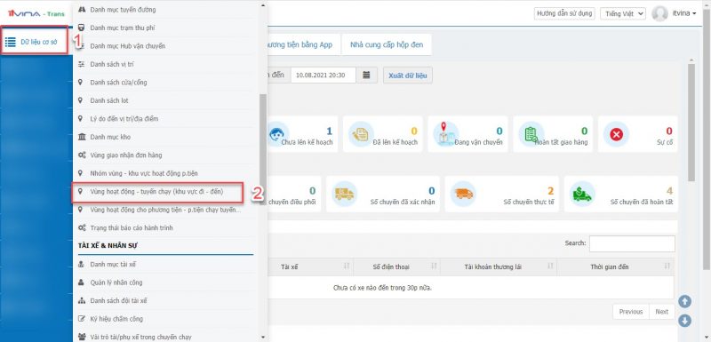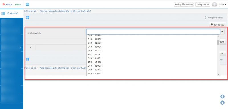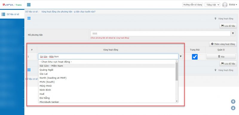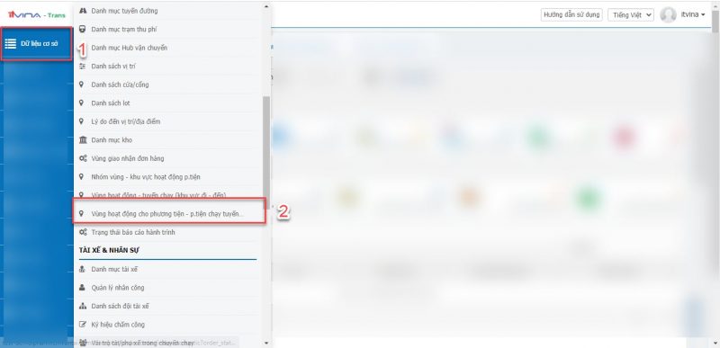 - Tại phân hệ Transport, chọn Dữ liệu cơ sở -> Vùng hoạt động của phương tiện