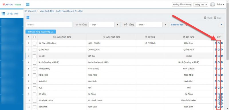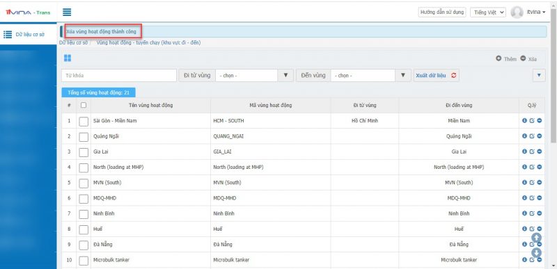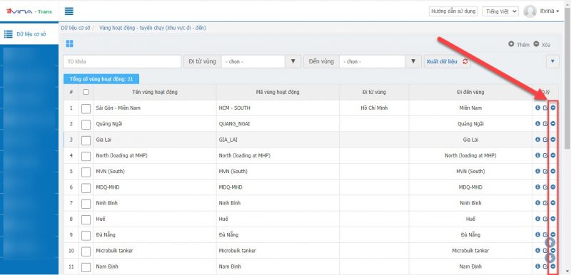 - Tại phân hệ Transport, chọn Dữ liệu cơ sở -> Vùng hoạt động – tuyến chạy